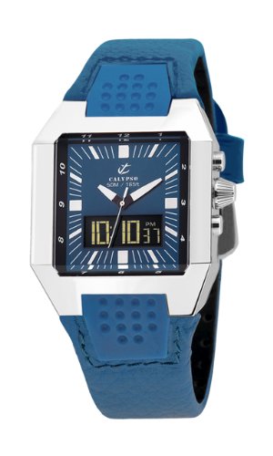 The Calypso Men's Blue Dial Analog and Digital Watch brings a pop of color to your urban wardrobe. It features a rectangular blue dial offering both analog and digital timekeeping. The wide, silver-toned hands point to silver-toned bar-shaped hour indexes while a digital screen with a black background displays time on the lower half of the dial. The watch offers a handy alarm function so you'll never be late for appointments. Plus, the stainless steel case and bezel make it durable enough to wear daily. The blue watch band is made from soft leather and is secured with a buckle clasp. The watch is equipped with reliable Japanese quartz movement and is water resistant to 165 feet (50 meters)..../ Calypso Men's K5335/1 Blue Strap Blue Dial Analog and Digital Watch / Water Watches